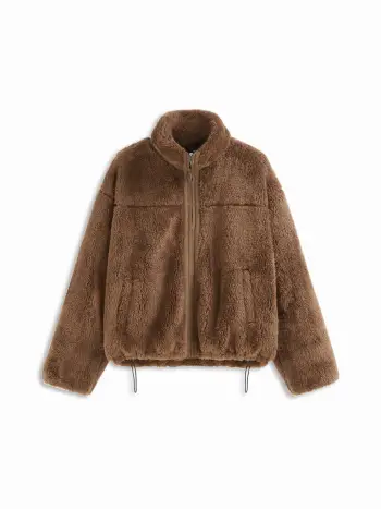 Cozy fleece zip-up jacket featuring a waist-cinching drawstring.