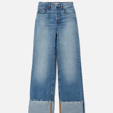 Trendy high-rise denim with a wide leg cut and cuffed hems.